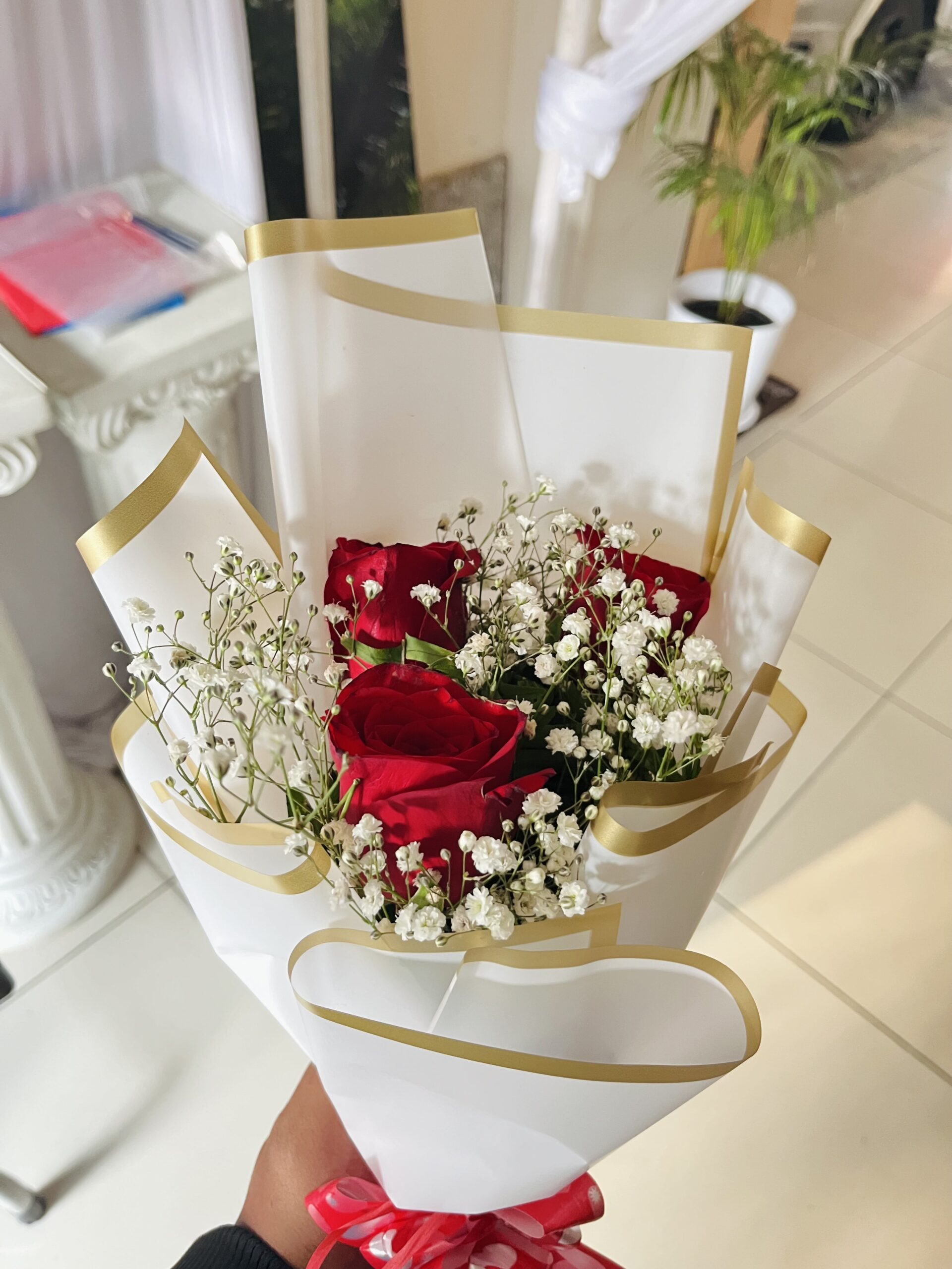 This elegant bouquet features three premium crimson roses nestled in a delicate bed of baby’s breath. Wrapped in sophisticated gold-trimmed paper and finished with a vibrant ribbon, it is the perfect heartfelt gesture for birthdays, anniversaries, or ‘just because’ moments.