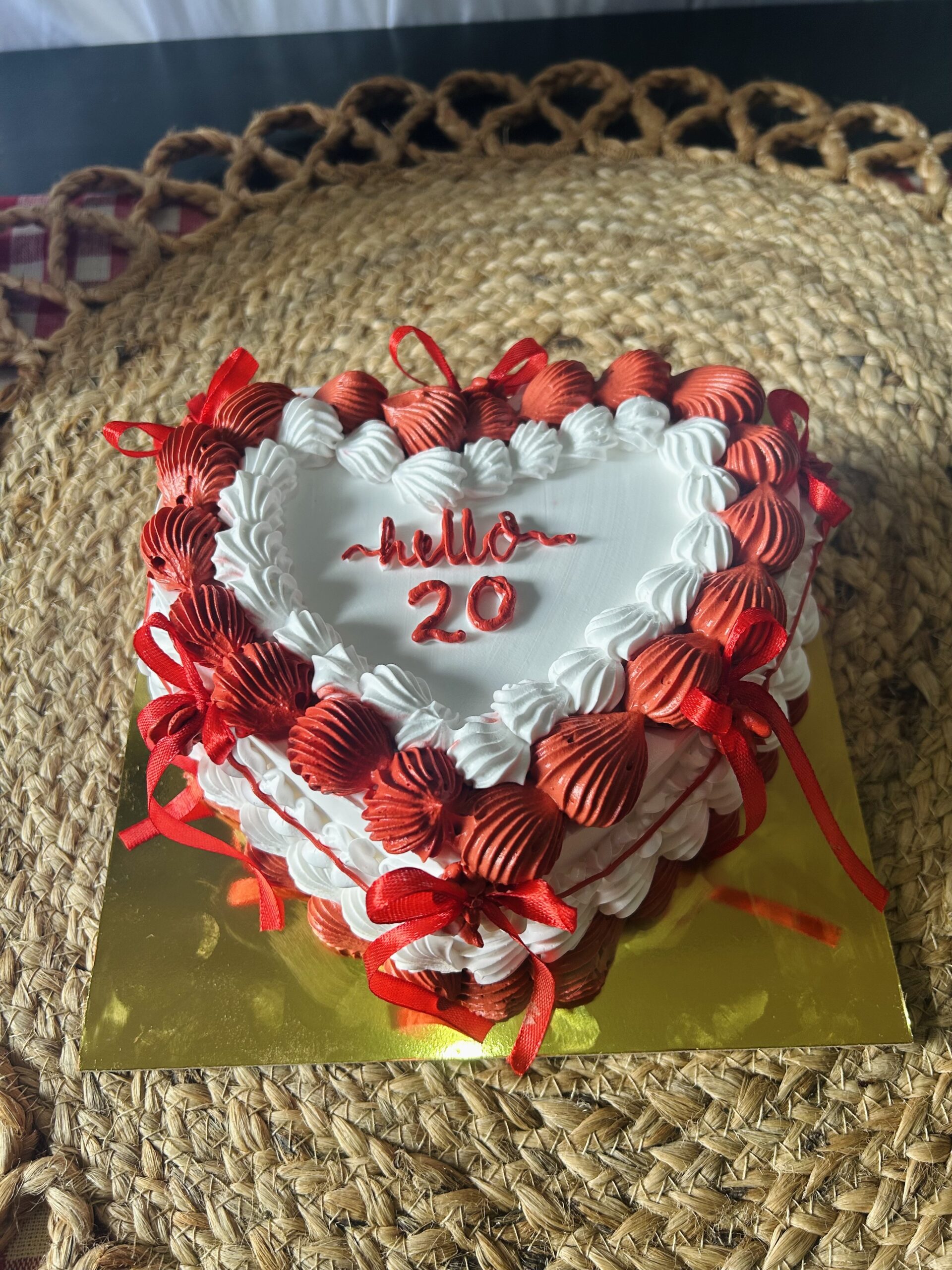 Featuring bold red and white piping and signature satin bows, our Vintage Heart Cake is the ultimate celebration treat. Customizable for any age or milestone.